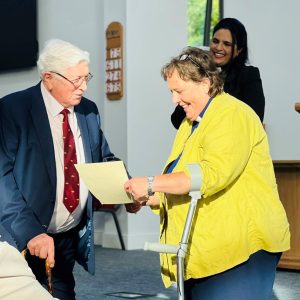 At Emmanuel Church Eastbourne, a visit by the Revd Bridget Banks, Moderator of Southern Synod, was organised for the Revd Howard John to be presented with a certificate to celebrate 70 years of his ordained ministry.