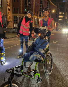 But they won’t be travelling by conventional methods. There will be five wheelchair users being pushed along the 200km road trip. Each will have a team of four or five skaters.